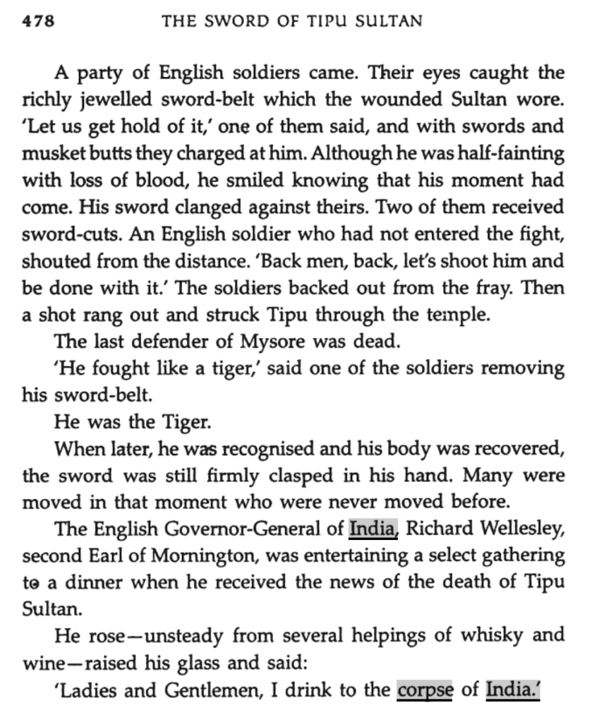 Yet Gidwani’s bestselling book, first published in 1976 and subsequently adapted for Indian television, was subtitled A Historical Novel about the Life and Legend of Tipu Sultan of India. Gidwani described his extensive research into Tipu Sultan’s life and times in the author’s note but unambiguously identified his book as a work of historical fiction, complete with ‘imaginative judgements’ and ‘invented’ dialogue intended to fill out his characterization of the Tiger of Mysore. I searched the 2015 edition on Amazon Preview and discovered that the ‘corpse of India’ toast was the final line in the novel.