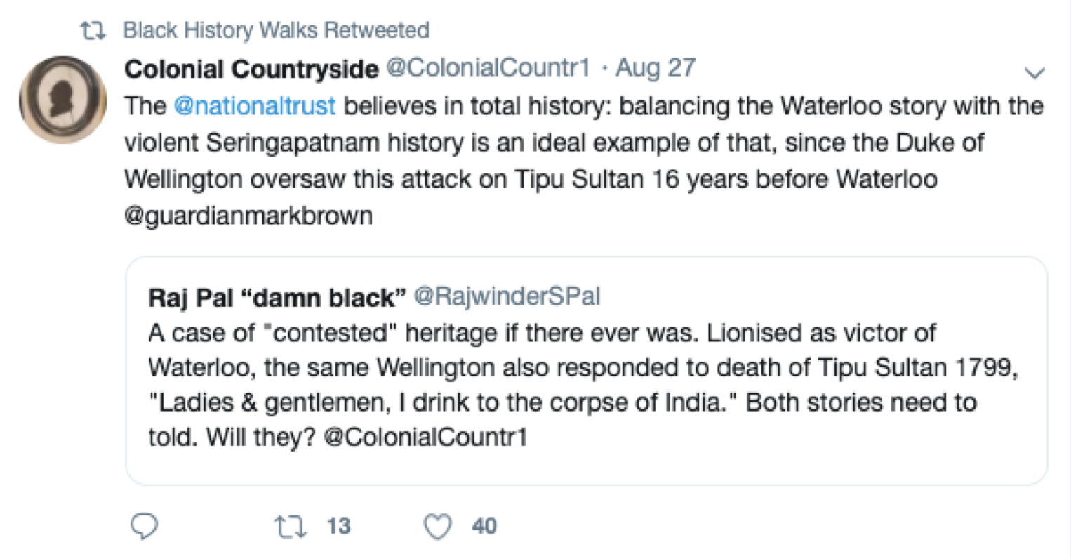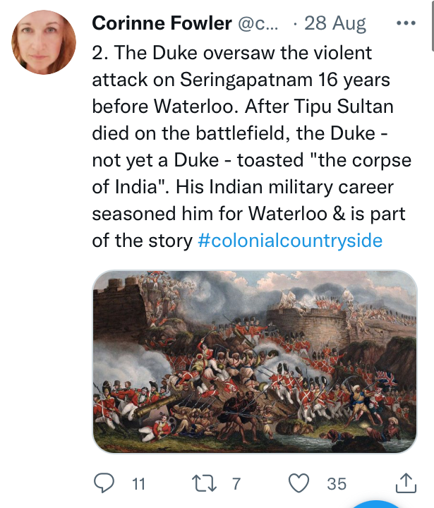 In late August, the ‘Colonial Countryside’ project, an initiative that partners with the National Trust to facilitate discussion of colonial history, called for public interpretations of the Duke of Wellington to give more prominence to his early military service in India. In support of this reasonable suggestion, it shared a claim that the future Lord Wellington had celebrated the death of Tipu Sultan, slain during the British storming of Seringapatam (Srirangapatna) in 1799, with a contemptuous toast: ‘Ladies & gentlemen, I drink to the corpse of India.’ The anecdote was reiterated on social media by the project’s leader, Professor Corinne Fowler, as a means of emphasizing Wellington’s involvement in the British subjugation of the Indian subcontinent.