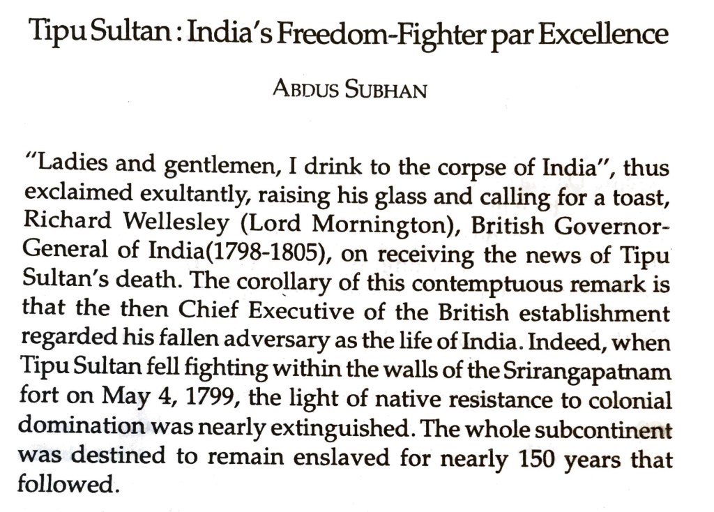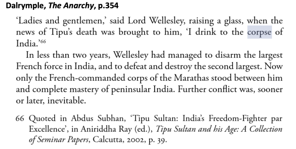 In fact, the only work I could find which furnished a reference for Mornington’s ostensible ‘corpse of India’ comment was Kabir Kausar’s Secret Correspondence of Tipu Sultan (New Delhi, 1980), available on Archive.org. On page 33, Kausar presented the episode as fact and cited The Sword of Tipu Sultan by B.S. Gidwani.