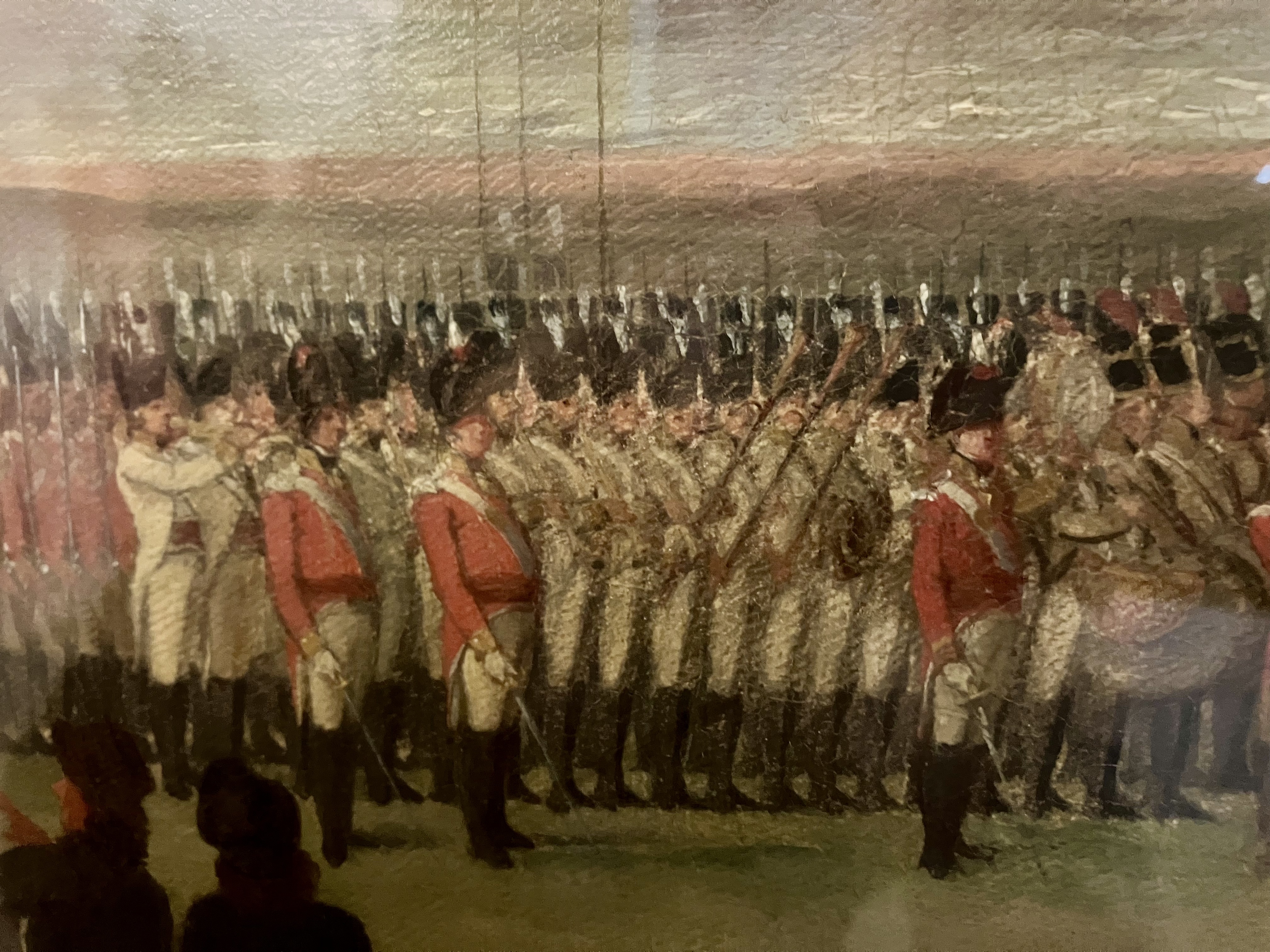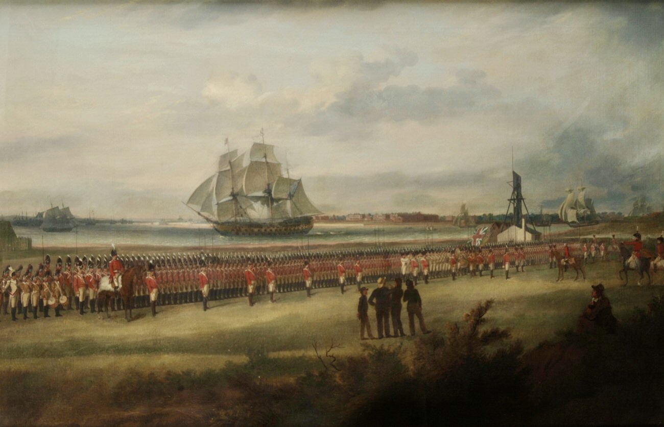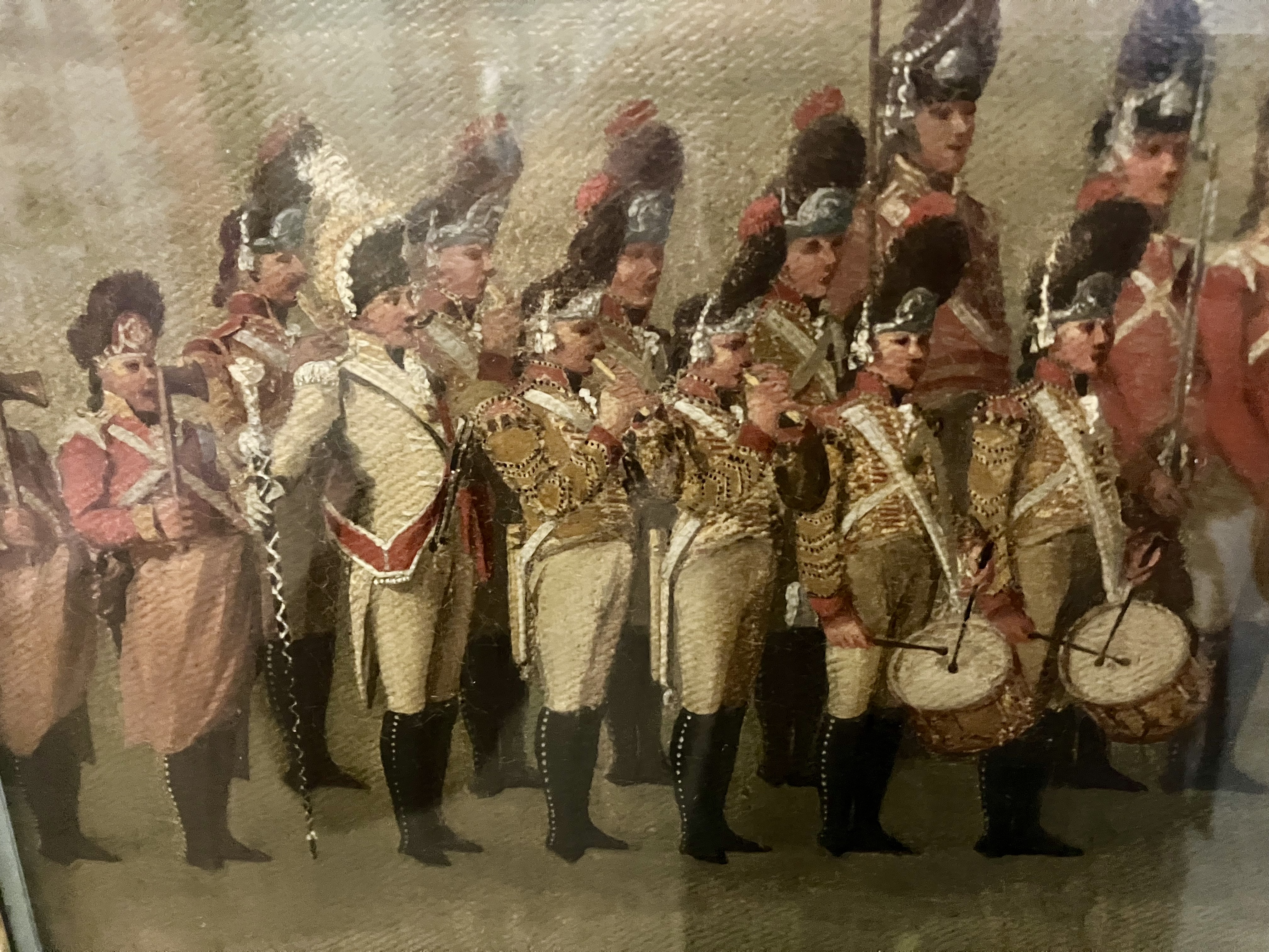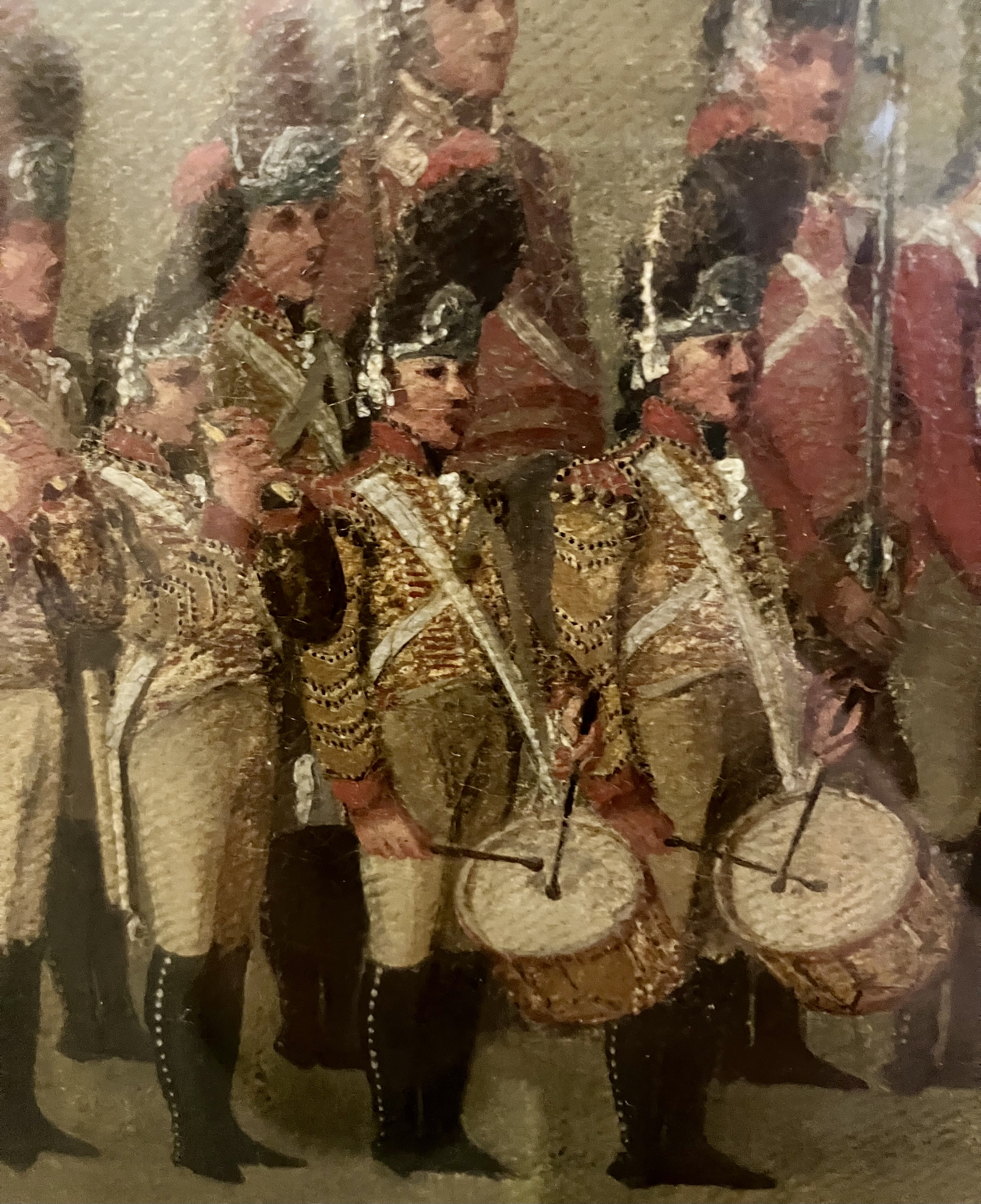 The Portsmouth Museum and Art Gallery is home to a fine depiction of a review of the Worcestershire Militia by Richard Livesay. The painting shows Major-General John Whitelocke, who later led a British army to ignominious defeat in South America, inspecting the corps on Southsea Common in October 1800 during the French Revolutionary War. A rare portrayal of an entire regiment drawn up in line, the artwork is of special interest to me on account of its detailed renderings of drummers and band musicians assembled on parade. Although the Reverend Percy Sumner published a brief description of the painting in the Journal of the Society for Army Historical Research in 1946, a recent visit to the museum gave me the opportunity to more closely inspect and photograph the canvas.
