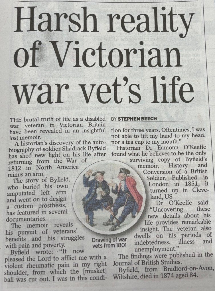 My research on Shadrack Byfield – an English War of 1812 veteran who buried his own severed arm, designed a custom prosthesis, and went on to write multiple memoirs – has recently been published in the Journal of British Studies. The article, “From Amputee to Author”, is freely available on the JBS website. This publication marks the culmination of a decade of intermittent detective work into the colourful life of a remarkable and very strong-willed man, and uses Byfield’s experiences as a means of thinking more broadly about the history of disability, veterans, and military autobiography.