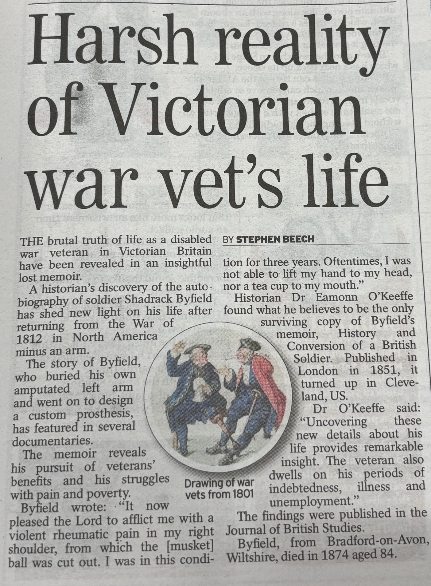 O’Keeffe uses Byfield’s lively and often moving story as a case study through which to explore the broader experiences of British veterans returning home after the Napoleonic Wars.