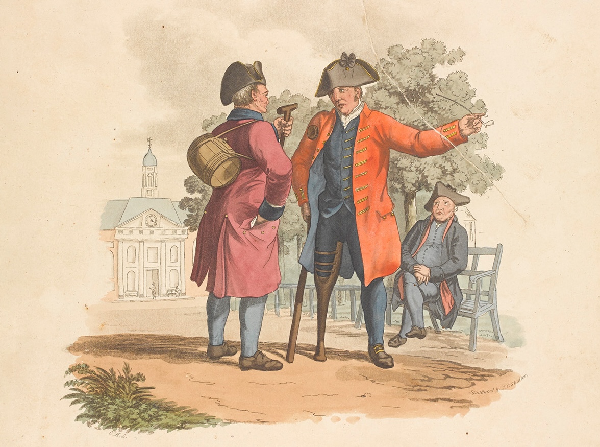 ‘Chelsea Pensioners’. Aquatint by J.C. Stadler after Charles Hamilton Smith, 1812. NAM 1950-11-33-48.
